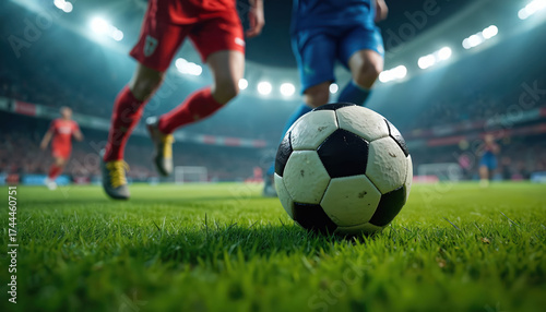 © Viktor, Fototapeta premium Soccer ball rests on green grass field during night match. Players in red and blue uniforms run past under bright stadium lights. Intense competition unfolds on the pitch.