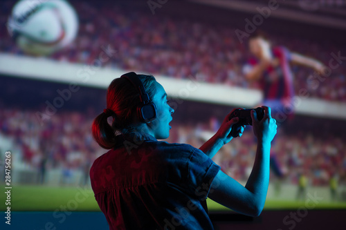 Fototapeta premium Soccer game, girl gamer playing a game in football headphones on a big...