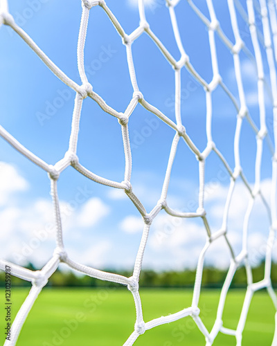 Fototapeta premium Soccer goal net close-up sports field daylight perspective