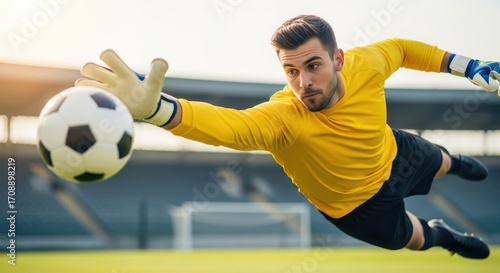 © Lugon, Fototapeta premium Soccer goalkeeper diving to save a soccer ball during a match.