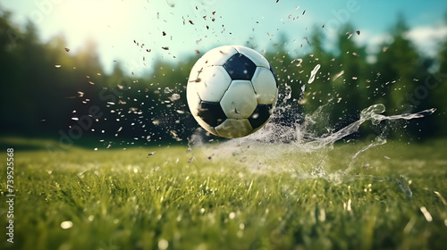 Fototapeta premium Soccer player falling and kicking ball on grass field - Ai generated