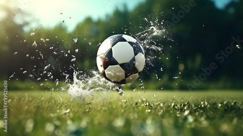 © madyshah783, Fototapeta premium Soccer player falling and kicking ball on grass field - Ai generated