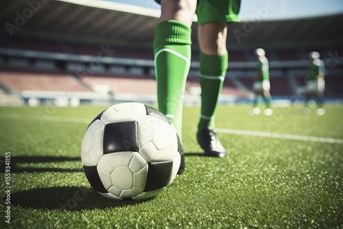 © nsit0108, Fototapeta premium Soccer player getting ready to kick the ball during a sunny day in a stadium
