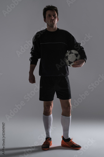 Fototapeta premium Soccer player in a black sportswear holding soccer ball in hands looking at...