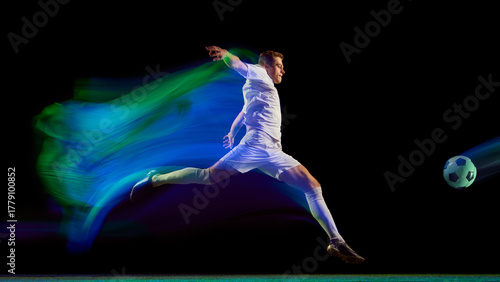 Fototapeta premium Soccer player kicking ball with green and blue neon motion trail on dark field. Concept of performance, ambition, and athletic energy in sports campaigns and digital design visuals.