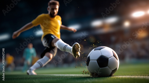 Fototapeta premium Soccer player kicks, ball full force, green stadium field, dirt flying cleats, dynamic motion display, football energy concept, male athletics summer, sport goal attempt, match int