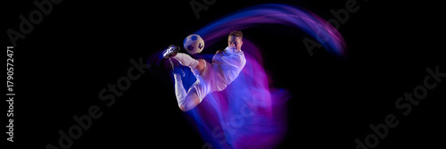 Fototapeta premium Soccer player performing overhead kick with dynamic neon trail on black background. Concept of ambition, skill, courage, and drive in sport, fitness promotion, and creative advertising visuals. Banner