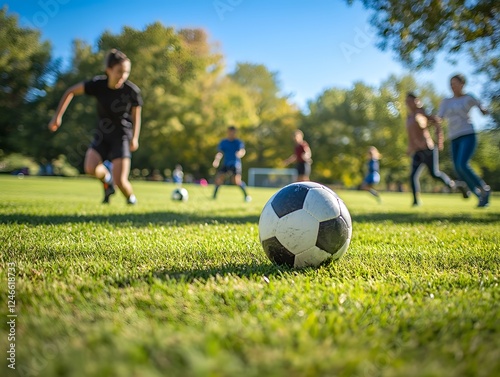 © Natanong, Fototapeta premium Soccer players kicking and running on a grassy field during an outdoor sports competition or training session