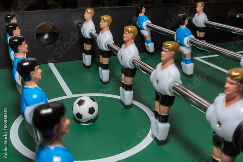 Fototapeta premium Soccer table game. Green field with blue and white plastic footballers