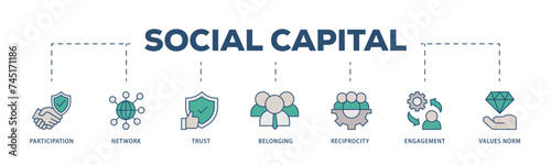 © kirale, Obraz premium Social capital icons process structure web banner illustration of participation, network, trust, belonging, reciprocity, engagement, and values norm icon live stroke and easy to edit