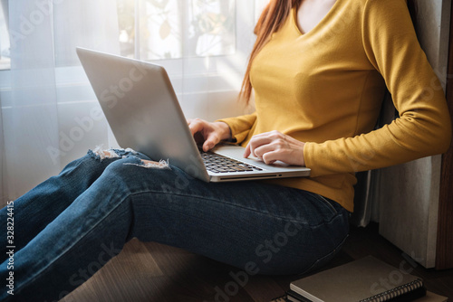 Naklejka premium Social media and virtual marketing including typing keyboard and laptop computer in the morning.
