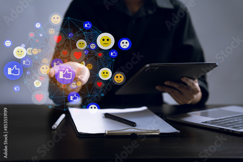 Fototapeta premium Social media digital in virtual icon globe shape business open his hand, working touch screen tablet.