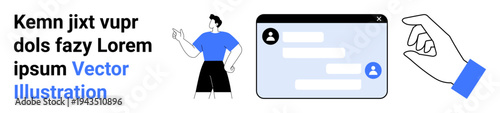 Fototapeta premium Social media, online messaging, communication, technology interaction, virtual connection, interface design. A person stands near a chat window, and a hand interacts with the interface. Social media