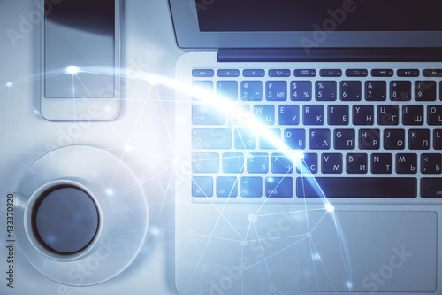 © peshkova, Naklejka premium Social network hologram drawings over computer on the desktop background. Top view. Double exposure.