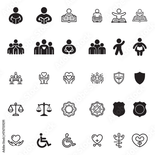 © SHAMSUL, Fototapeta premium Social policy icons outline and solid vector set silhouette