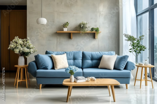© wiparat, Fototapeta premium sofa against concrete wall. Scandinavian loft home interior design living room