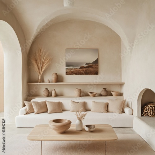 © Five Million Stock, Fototapeta premium Sofa against fireplace in room with arch window and ceiling. Mediterranean interior design of modern living room.