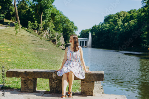 Naklejka premium Sofia Park, Uman. Young woman sitting on a bench on the background of the lake with a fountain. The girl in a dress sits on a stone bench. Girl on a tour of the national park on a summer day.