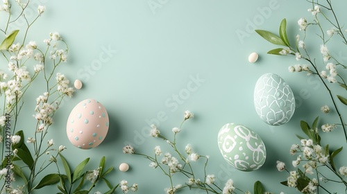 Fototapeta premium Soft and Airy Spring Layout Featuring Pastel Easter Eggs Surrounded by Delicate Blooms on a Mint Green Background