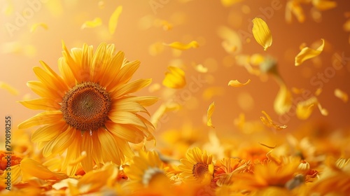 © Thanate, Fototapeta premium Soft and Delicate: Sunflower, Marigold, and Safflower Petals Falling on Light Orange Surface, View from Top