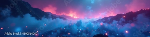 © Namwan, Fototapeta premium Soft and glowing blue bokeh lights blend into a rainbow-colored misty landscape, glowing mist, mystical scene