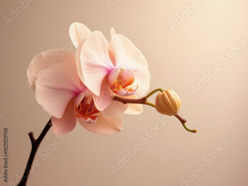 © goraillafun, Obraz premium Soft apricot orchid with bud – floral macro on warm pastel background