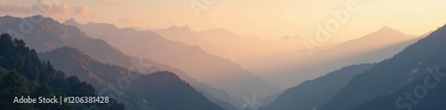 Fototapeta premium Soft beige hues on a misty mountain landscape at dawn, peaceful ambiance,...