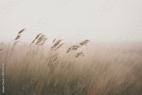 Obraz premium Soft beige meadow grass swaying in gentle wind under pale sky, minimal...