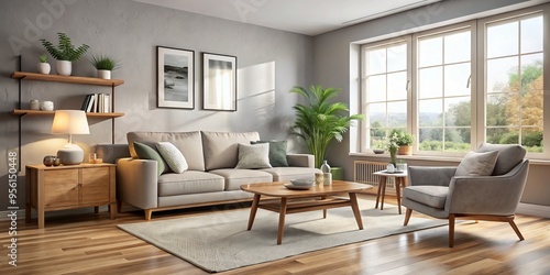 © DigitalArt Max, Fototapeta premium Soft beige sofa, sleek wooden console table, and stylish gray armchair create a warm and inviting atmosphere in