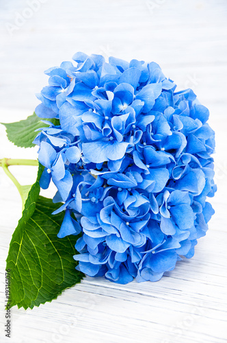© Kira, Obraz premium Soft blue Hydrangea on white woden