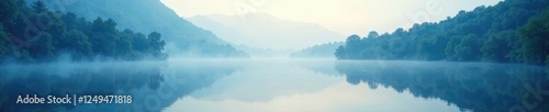 © Supharak wonginyoo, Fototapeta premium Soft blue morning light peeks over a quiet lake, serene environment, lake landscape, reflection