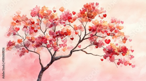 Fototapeta premium Soft Brown Painted Tree with Branches and Colorful Heart Leaves