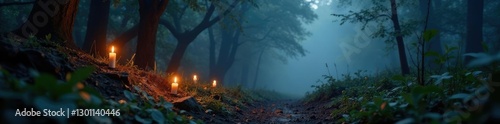 © Phetthanousack, Fototapeta premium Soft candlelight casting shadows on misty forest floor, mystical, ambiance