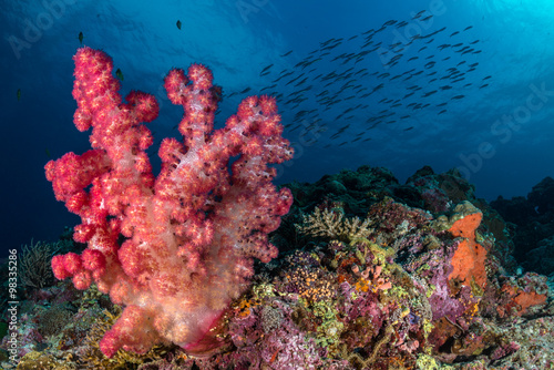 Naklejka premium Soft coral with fish shoal in the background, Calanggaman