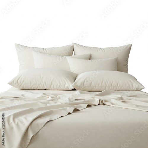 © Shavy, Obraz premium soft cream white pillows on crisp white bed sheets with wrinkled bedding in minimalist bedroom setting
