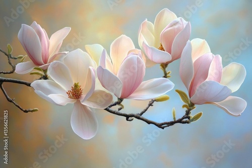 Fototapeta premium Soft, delicate pastel flowers bloom gracefully on the branches of a tree.