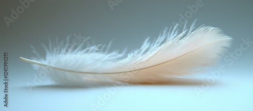 © Seyyar, Obraz premium Soft delicate white feather gracefully resting on a light background showcasing its intricate textures and natural beauty.