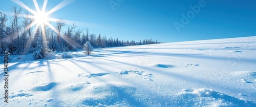 © photohappy, Obraz premium Soft, diffused winter sunlight on a snowy landscape with glittering ice crystals, soft light, ray of light