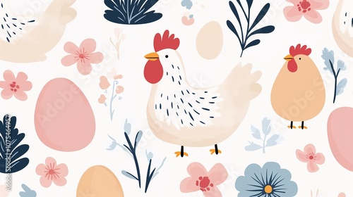 Obraz premium Soft Floral Pattern with Easter Chickens and Eggs