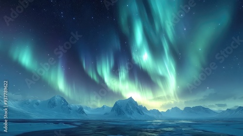 Naklejka premium Soft, flowing auroras in pastel hues illuminating a tranquil, star-filled...
