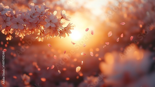 Fototapeta premium Soft focus cherry blossom scene during golden hour petals drifting down in a...