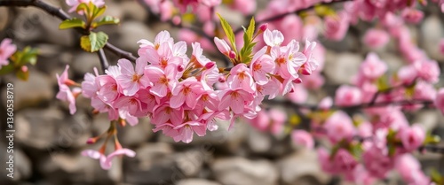 © dadtophoto, Obraz premium Soft focus cherry blossoms blooming against a gently blurred stone wall background, light, stone wall, beauty