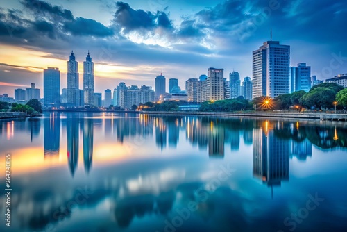 Fototapeta premium Soft focus cityscape at dusk with silvery hues of blue and gray blending into...