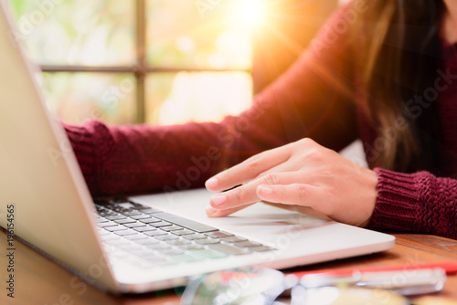 © Siam, Fototapeta premium Soft focus Closeup woman hand working on her laptop. Social networking technology concept.