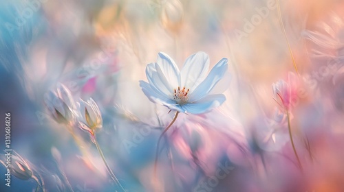 © BerkahStock, Fototapeta premium Soft focus dreamy white cosmos flower in pastel field.
