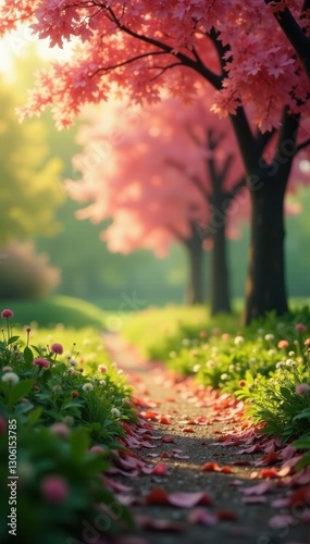 © Busban, Naklejka premium Soft focus garden trees, blurred bokeh background, overgrown, mellow