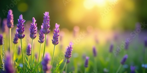Fototapeta premium Soft focus lavender meadow with sunlight filtering through, meadow, nature, greenery