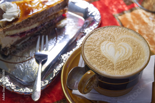 © Ilja, Naklejka premium Soft focus of a cup of coffee and cake on ventage background.