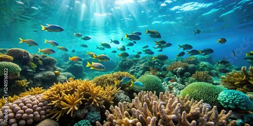 Fototapeta premium Soft focus of coral reef in turquoise water with schools of small fish swimming around, vibrant colors, underwater, coral