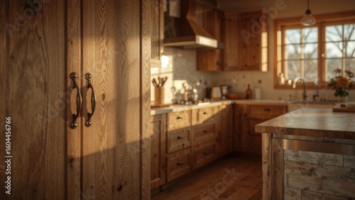 Obraz premium Soft Focus of Warm Rustic Kitchen with Wooden Cupboards and Natural Lighting